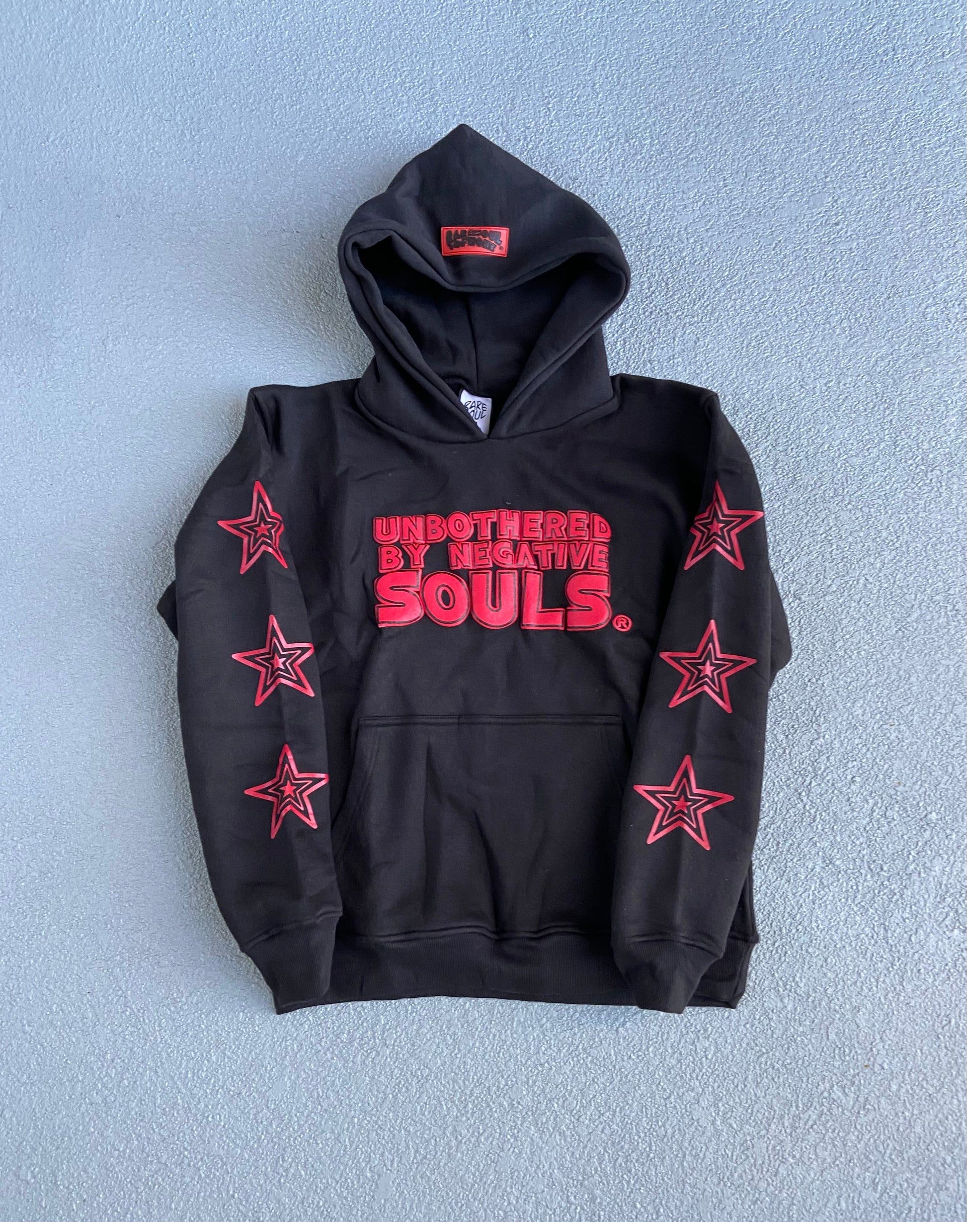 Introducing our Black & Red Hoodie. Made with 85% cotton and 15% polyester heavyweight fleece, this solid color hoodie features a rubber label on the hood and a kangaroo pouch front pocket. True to size for a regular fit, or size up for an oversized look. Hand wash or wash in cold water and hang dry in shade. Rare Soul Hoodies are final sale and may not be returned, modified, or exchanged.